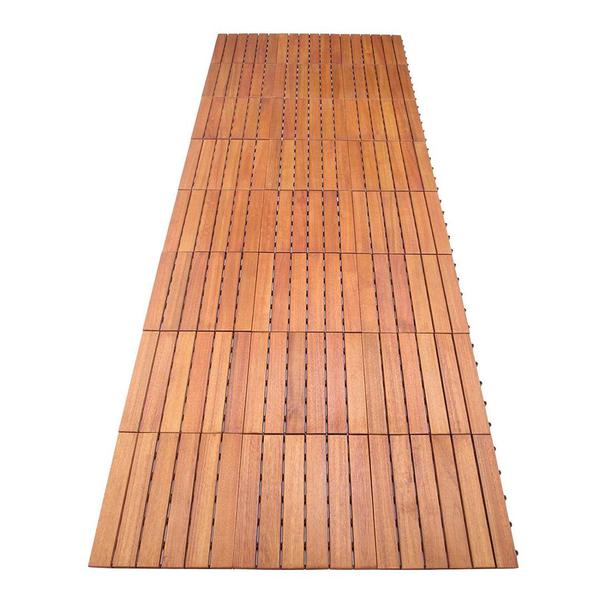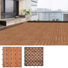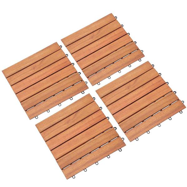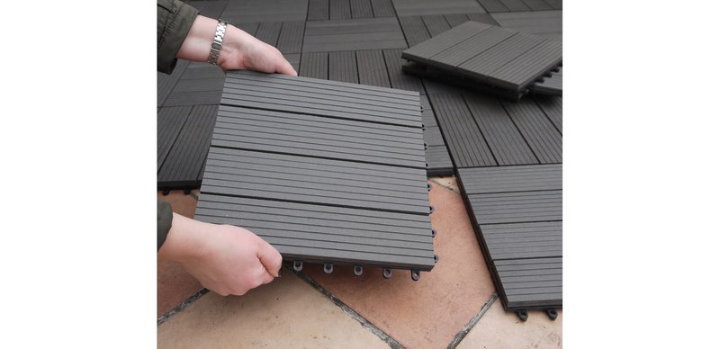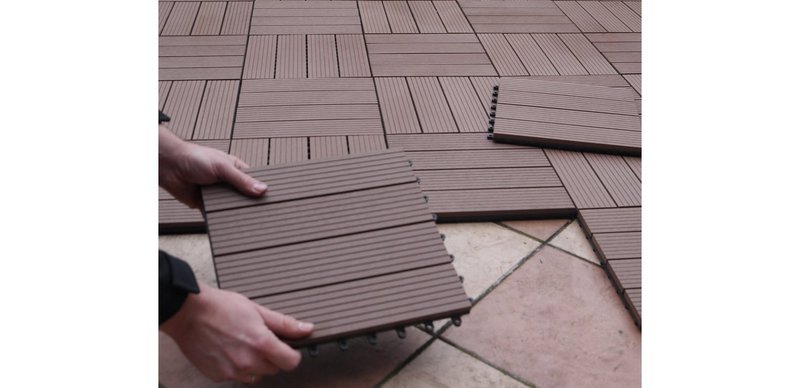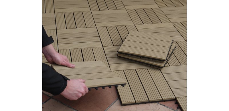 Die Fliesen lassen sich einfach ohne weiteres Zubehör miteinander verbinden, der Untergrund muss dabei stabil sein. Gelegentlich mit Seifenwasser reinigen, bei hartnäckigen Verschmutzungen schmutz- und fettlösende oder spezielle WPC Reinigungsmittel verwenden. Schwamm und Bürste dabei benutzen.